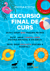 - Per a l’excursió a Aquaval del 25 de juliol grups Campa i Urba: tornada a casa sobre les 16 h (arribarem cap a les 16:45-17 h) – heu de dur el dinar (els de menjador tenen pic-nic) i diners de butxaca (màxim 5€)